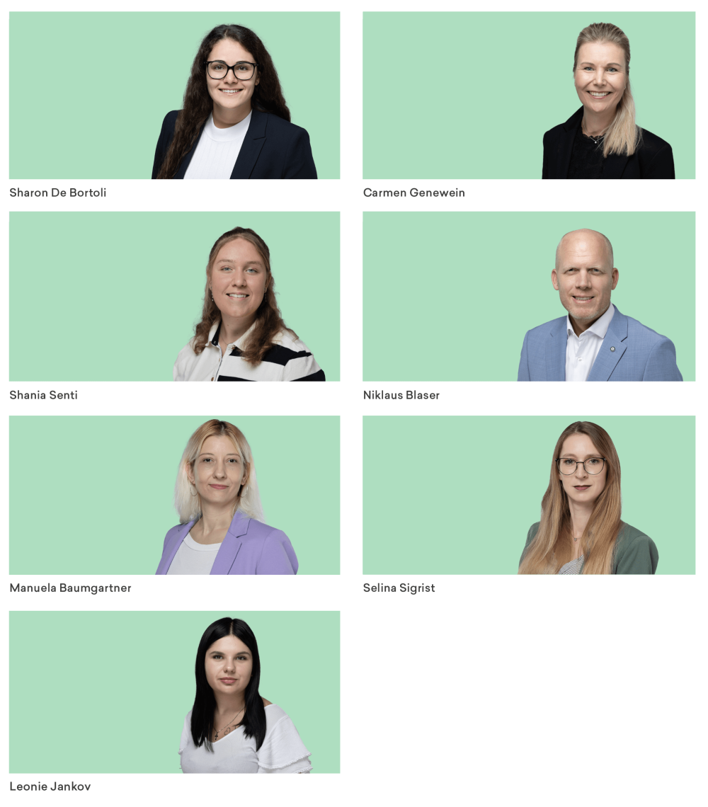 Zur Verstärkung unseres Teams durften wir im Jahr 2024 Sharon De Bortoli (1. April 2024), Carmen Genewein (1. August 2024), Shania Senti (1. August 2024), Niklaus Blaser (12. August 2024), Manuela Baumgartner (1. September 2024) und Selina Sigrist (1. November 2024) willkommen heissen.